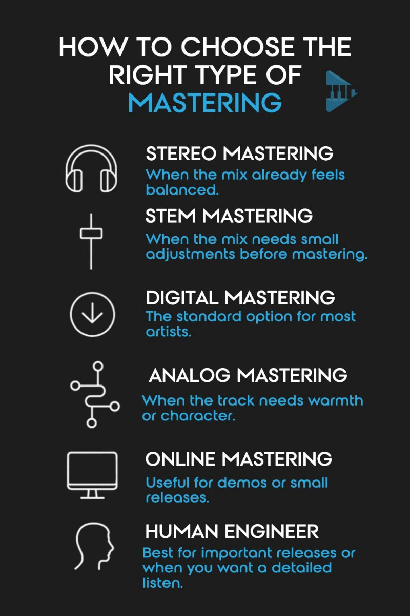A stereo master works from one single stereo file. Everything is already baked together. This is the standard option, and it is what most tracks need.