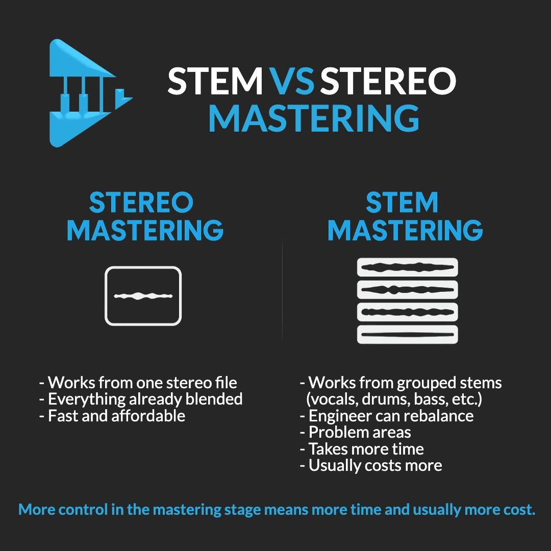 A stem master works from grouped stems. One stem for vocals. One for drums. One for guitars or synths. The engineer can adjust each group before finalising the master. More control means more time, and more time usually means a higher cost.